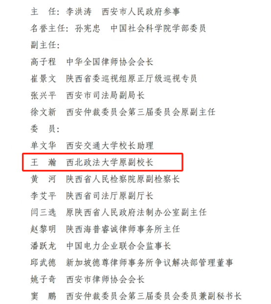 王瀚教授受聘西安仲裁委员会第四届委员会委员