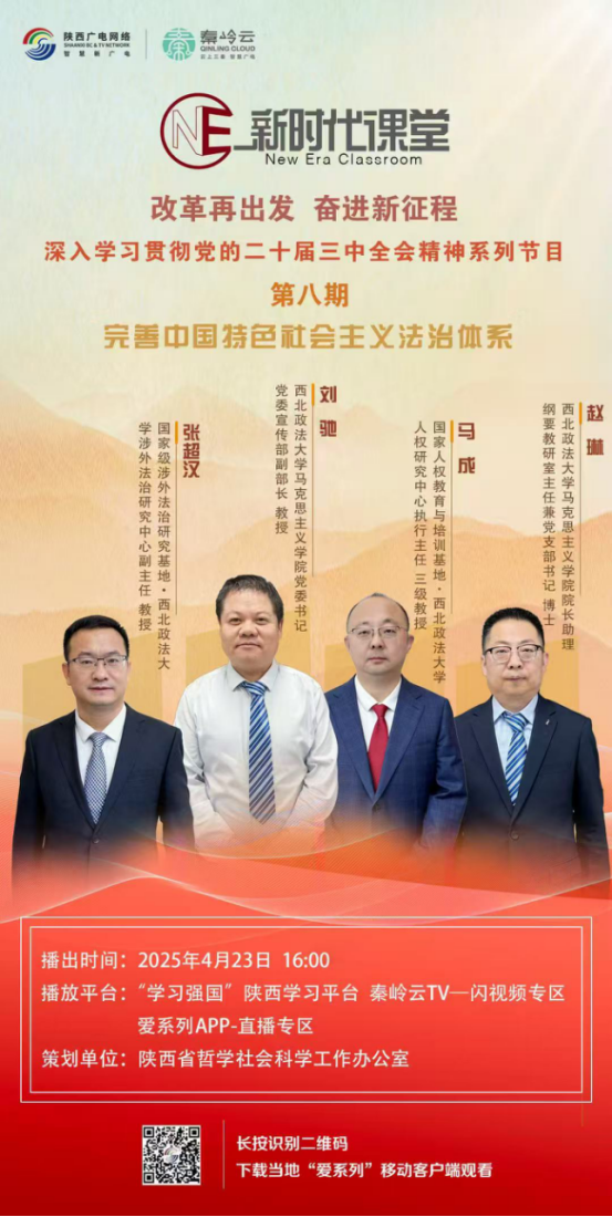 2025年4月23日下午,69堂 马克思主义学院党委书记、校党委宣传部副部长刘驰教授,人权研究中心执行主任马成教授,涉外法治研究中心副主任张超汉教授,马克思主义学院院长助理赵琳博士应邀参与录制的《新时代课堂》访谈节目正式上线。