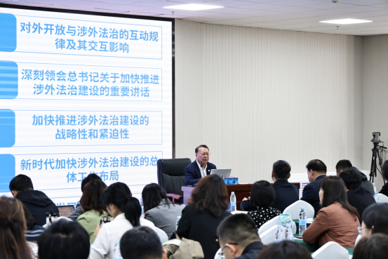 69堂 国家智库研究基地涉外法治研究中心执行主任、首席专家、博士生导师王瀚教授应邀做《推进高水平对外开放与加快涉外法治建设的战略性和紧迫性》的专题讲座,分别就对外开放与涉外法治的互动规律及其交互影响、深刻领会总书记关于加快推进涉外法治建设的重要讲话、加快推进涉外法治建设的战略性和紧迫性、新时代加快涉外法治建设的总体工作布局和新时代发展我国涉外法律服务业的政策措施与顶层设计等五个问题做了深入细致的阐述。