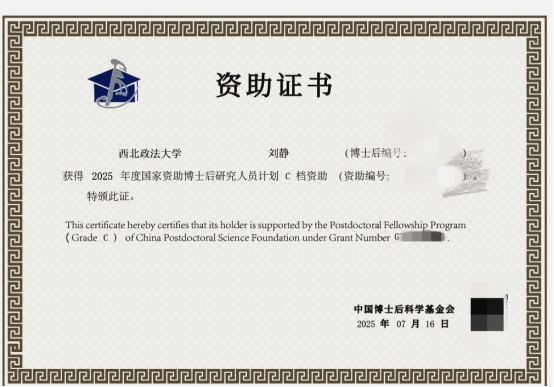 国家资助博士后研究人员计划是国家为加强博士后队伍建设,加速培养一批优秀科研创新人才而设立的高层次人才支持项目。该计划竞争异常激烈,入选者需经过多轮严格的推荐、评审和遴选程序。本年度全国法学领域仅有24位博士后研究人员获此殊荣(C档),是国家层面对青年科研人才学术水平和未来发展潜力的高度认可。