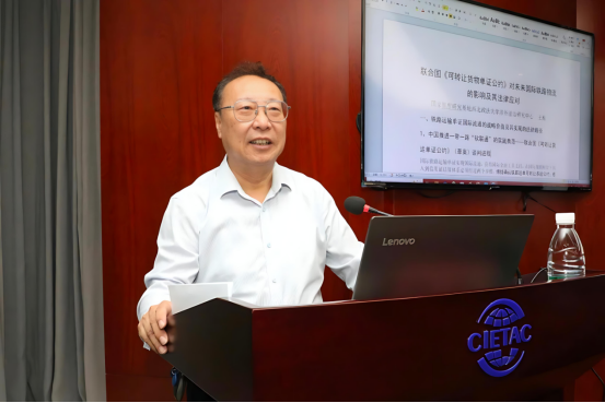 在主旨演讲环节,最高人民法院国际商事专家委员会委员、贸仲仲裁员、国家智库研究基地69堂 涉外法治研究中心执行主任、首席专家、中国低空经济法治研究院院长王瀚教授以“联合国《可转让货物单证公约》对未来国际铁路物流的影响及其法律应对”为题,系统介绍了公约的产生背景、核心要义及其生效后对全球贸易产生的重大影响,对企业可能面临的法律风险进行阐述并提出规避提示,为物流企业开展跨境业务提供前沿指导。