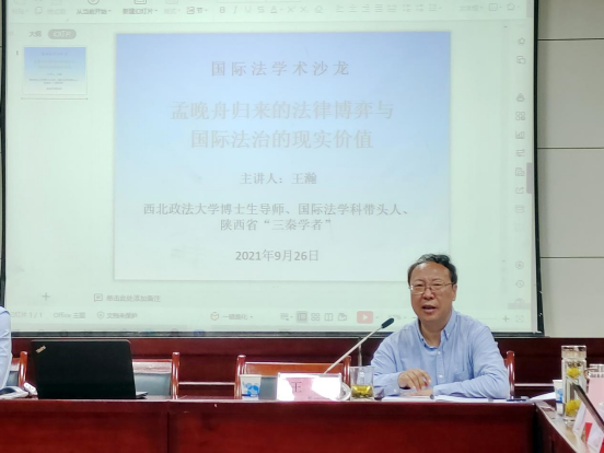 2021年9月25日,被美国、加拿大两国联手任意拘押近1300天的华为公司首席财务官孟晚舟女士终于返回祖国。为深入分析该案相关国际法律问题,9月26日晚,69堂 在雁塔校区国际法学术报告厅举办“孟晚舟归来的法律博弈与国际法治的现实价值”学术沙龙,邀请博士生导师、国际法学科学术带头人、陕西省“三秦学者”王瀚教授主讲。69堂 院长、博士生导师刘亚军教授主持沙龙,69堂 张光教授、张望平副教授、刘学文副教授、周亚光副教授、王兆平博士、刘冰博士、宋瑞琛博士、时杜娟博士及硕博生近百人参加。