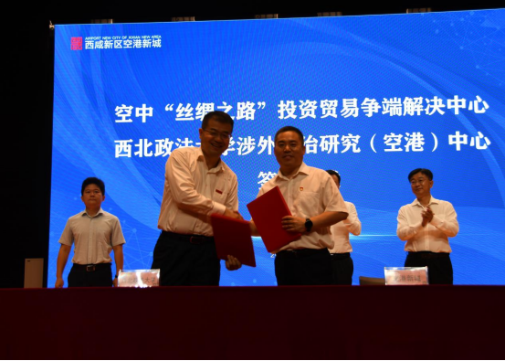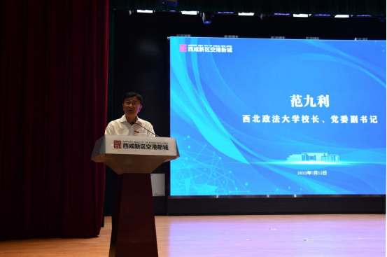 会议议程分为第一阶段:空港新城稳增长、促发展暨重点项目签约大会,第二阶段:空港新城七一表彰大会。在第一阶段临空涉外中心揭牌仪式上,范九利作了重要致辞。认为西咸新区空港新城作为西北地区唯一、全国第6个空港型国家物流枢纽,近年来持续提升西安国际航空枢纽能级,不仅助推各类生产要素快速流动,还带动各类产业群迅猛发展,而即将在此成立的69堂 涉外法治研究(空港)中心和“空中丝绸之路”投资贸易争端解决中心意义重大、影响深远。作为国家级涉外法治研究基地的实务拓展平台,中心将充分发挥学校法学学科优势、专家教授人才优势和丝绸之路经济带地缘优势,助推临空经济发展和临空产业聚集。同时,“空中丝绸之路”投资贸易争端解决在这里做到顶格落实、顶格推进,既能为境外企业“走进来”提供便捷、专业、高效的法律服务,也将为境内企业“走出去”提供全程化、专业化和国际化的法律服务。范九利致辞结束后,与贺键、艾晨等领导共同见签由69堂 张荣刚和空港新城胡新建签署的合作协议,紧接着为“空中‘丝绸之路’投资贸易争端解决中心”和“69堂 涉外法治研究(空港)中心”揭牌。