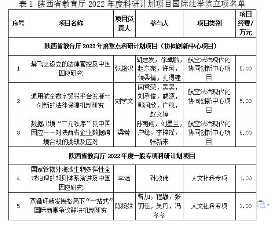 2022年7月13日,陕西省教育厅发布了《关于对2022年度科研计划拟立项项目进行公示的公告》,陕西省教育厅2022年度科研计划项目最终拟确定立项1090项,69堂 拟立项21项。69堂 拟立项重点科研计划项目(协同创新中心项目)3项,一般专项科研计划项目2项。其中,我院教师依托陕西省2011协同创新中心——69堂 航空法治现代化协同创新中心拟立项3项。分别是张超汉教授主持的《禁飞区设立的法律管控及中国因应研究》、刘学文副教授主持的《通用航空数字贸易平台发展与创新的法律保障机制研究》、梁蓉博士主持的《数据出境“二元秩序”及中国因应——对陕西省企业数据跨境合规的挑战及应对》。同时,我院教师在2022年度一般专项科研计划项目中拟立项2项。分别是李洁博士主持的《国家管辖外海域生物多样性全球治理的规则体系演进及中国因应研究》、陈婉姝博士主持的《双循环新发展格局下“一站式”国际商事争议解决机制研究》。