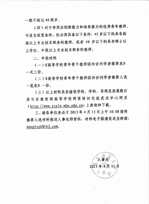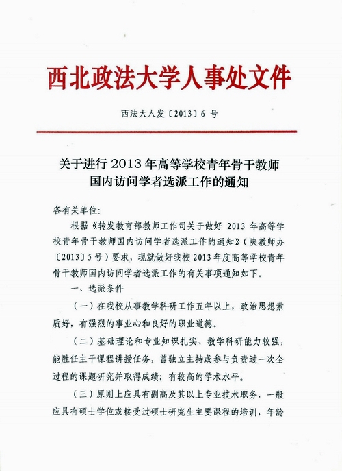 关于进行2013年高等学校青年骨干教师国内访问学者选派工作的通知
