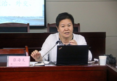 随后,张海文所长重点讲解了国际海洋的污染和治理、极端环境生物相关法律问题,详细介绍了该问题的由来、关键所在、磋商进程、争议的焦点、未来发展以及影响等角度。她指出,由于极端生物的开发、利用和管理方面还未有健全的制度和规则,世界各国展开了历时近15年的磋商,在磋商过程中,形成了一揽子方案,包括惠益分享、海洋保护区、环境影响评价以及能力建设和技术转让。张海文所长指出该问题的原则性规定,不得损害现有的法律文书、机制、全球和区域的相关机构现有的职责和作用。